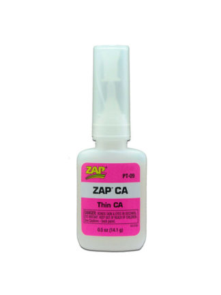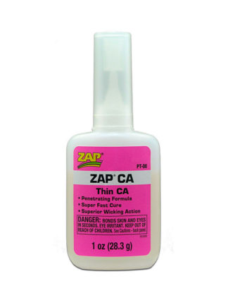 ZAP CA Is the thinnest CA in the ZAP product line. The penetrating or wicking ability of this glue makes it a favorite of modelers around the world. Balsa wood is bonded almost instantaneously, with the glue sometimes traveling several inches into the parts. The consistent performance and strength of the glue is what sets it apart from other brands. This product is also widely used throughout the hobby industry; the thin formula allows the glue to go where most cannot. Some uses besides hobbies and crafts include; jewelry manufacturing and repair, taxidermy, mold and pattern making, furniture refinishing and antique repair, auto detailing, archery, darts, dental molds and patterns, and ceramic repair. Wood turners like the penetrating ability for hardening soft areas and preventing the propagation of cracks. Furniture refinishers can count on ZAP CA to wick under loose veneer without having to remove the piece and chance damage. Mold and pattern shops coat the outside of the wood pattern, hardening it for final finishing. Cracks almost disappear in ceramic and hardened plaster pieces. Use it on fiberglass and cloth to bond, reinforce, and strengthen wood parts and assemblies. Plastic parts can be joined with an almost invisible seam.